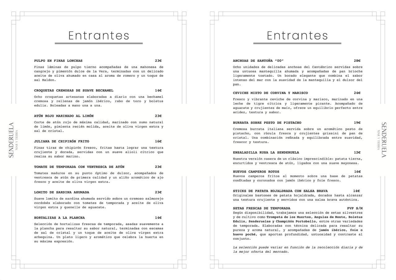 Del mar y de la tierra, de nuestra pasión por la gastronomía, por la hospitalidad y por el buen vino nace Restaurante Senderuela. Con el único objetivo de hacer disfrutar a todo aquel que entre por la puerta de nuestra casa. En nuestro Restaurante Senderuela Mar y Tierra queremos sorprender a nuestros huéspedes creando no la mejor experiencia sino una experiencia unica donde se palpe la humildad y la honestidad de un equipo joven creativo e ilusionado, que quiere reflejar su gusto por la gastronomía. Aspiramos a transmitir elegancia y excelencia tratando siempre con respeto tanto la huerta como el mar, la tierra y sus viñedos.