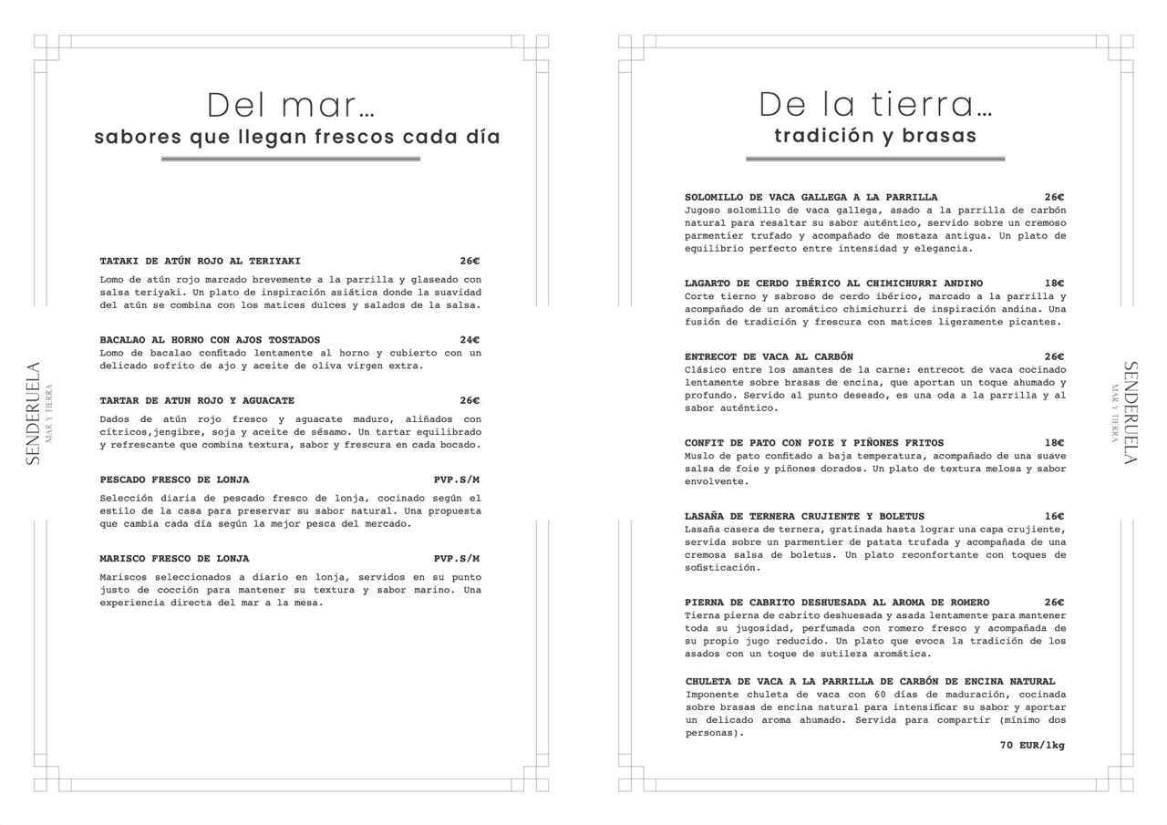 Sumérgete en una experiencia culinaria única donde la cocina de mercado se fusiona con toques creativos en un ambiente lleno de aromas y sensaciones en nuestro restaurante Senderuela. Nuestra carta propone una cocina internacional, viajada y cosmopolita que deleitará tu paladar y despertará tus sentidos. Déjate seducir por nuestra especialidad: pescados y mariscos a la parrilla, preparados con maestría para resaltar su frescura y sabor incomparables. Ubicado en un espacio elegante, nuestro restaurante cuenta con una encantadora terraza y diversos salones interiores que te invitan a disfrutar de una velada inolvidable en compañía de tus seres queridos. ¿Estás listo para explorar una experiencia gastronómica única en Senderuela? ¡Te esperamos con los brazos abiertos!